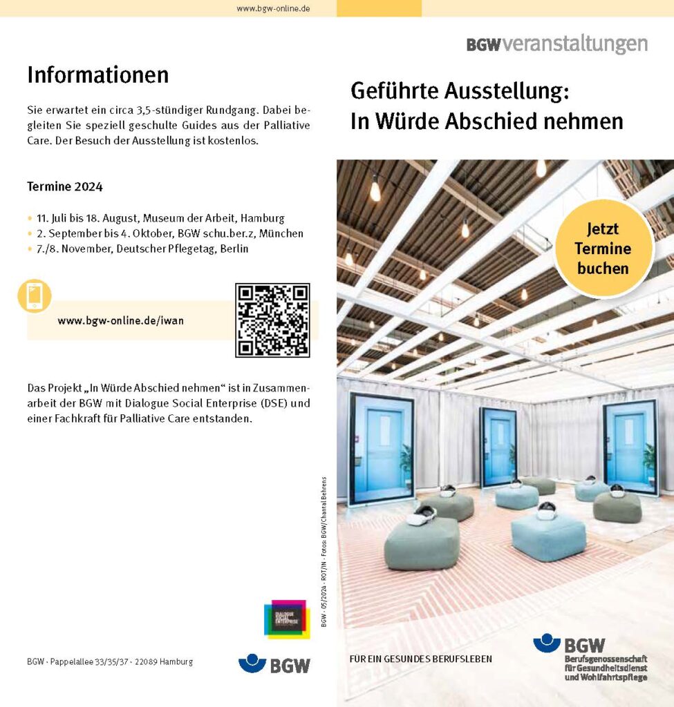 Sie erwartet ein circa 3,5stündiger Rundgang. Dabei begleiten Sie speziell geschulte Guides aus der Palliative Care. Der Besuch der Ausstellung ist kostenlos.